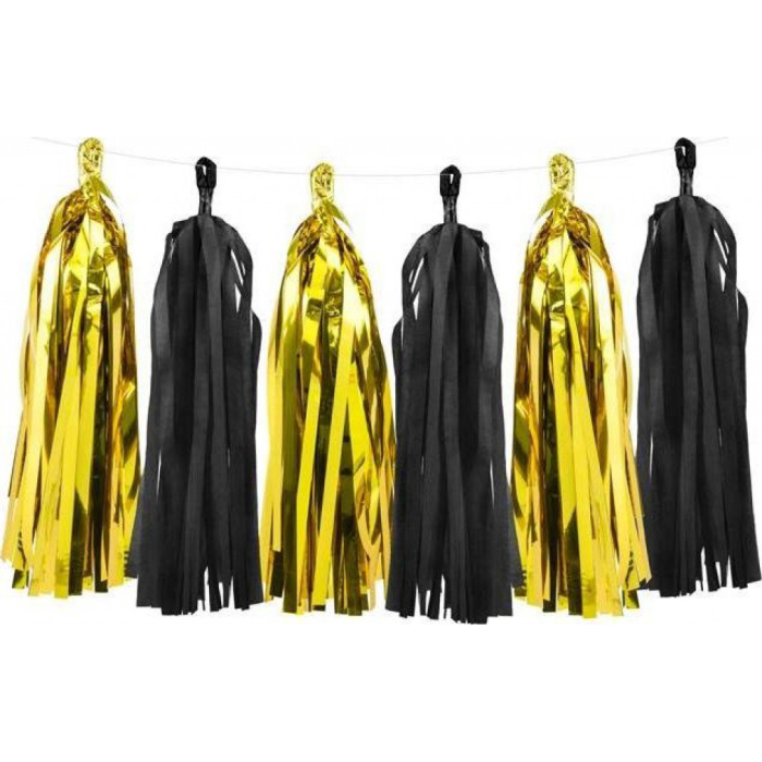 Ghirlanda cu ciucuri pentru auto-asamblare. Kitul contine 12 franjuri de culoare negru auriu si aproximativ. 2 metri de cordon alb.