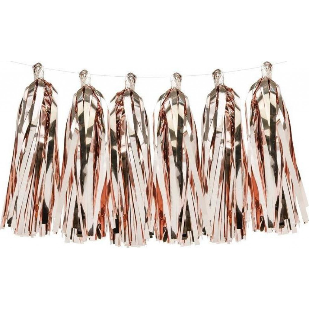Ghirlanda cu ciucuri pentru auto-asamblare. Kitul contine 12 franjuri de culoare roz auriu si aproximativ. 2 metri de cordon alb.